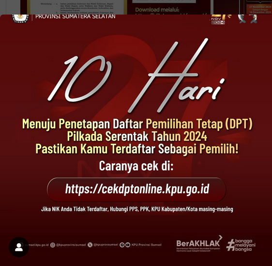 #Temanpemilih 10 Hari lagi menuju penetapan Daftar Pemilih Tetap (DPT) ayo pastikan namamu terdaftar dalam DPT. Cek melalui cekdptonline.kpu.go.id