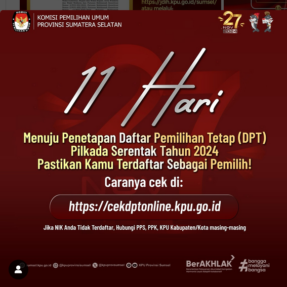 #Temanpemilih 11 Hari lagi menuju penetapan Daftar Pemilih Tetap (DPT) ayo pastikan namamu terdaftar dalam DPT. Cek melalui cekdptonline.kpu.go.id