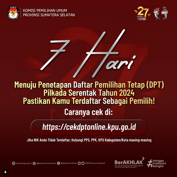 #Temanpemilih 7 Hari lagi menuju penetapan Daftar Pemilih Tetap (DPT) ayo pastikan namamu terdaftar dalam DPT. Cek melalui cekdptonline.kpu.go.id
