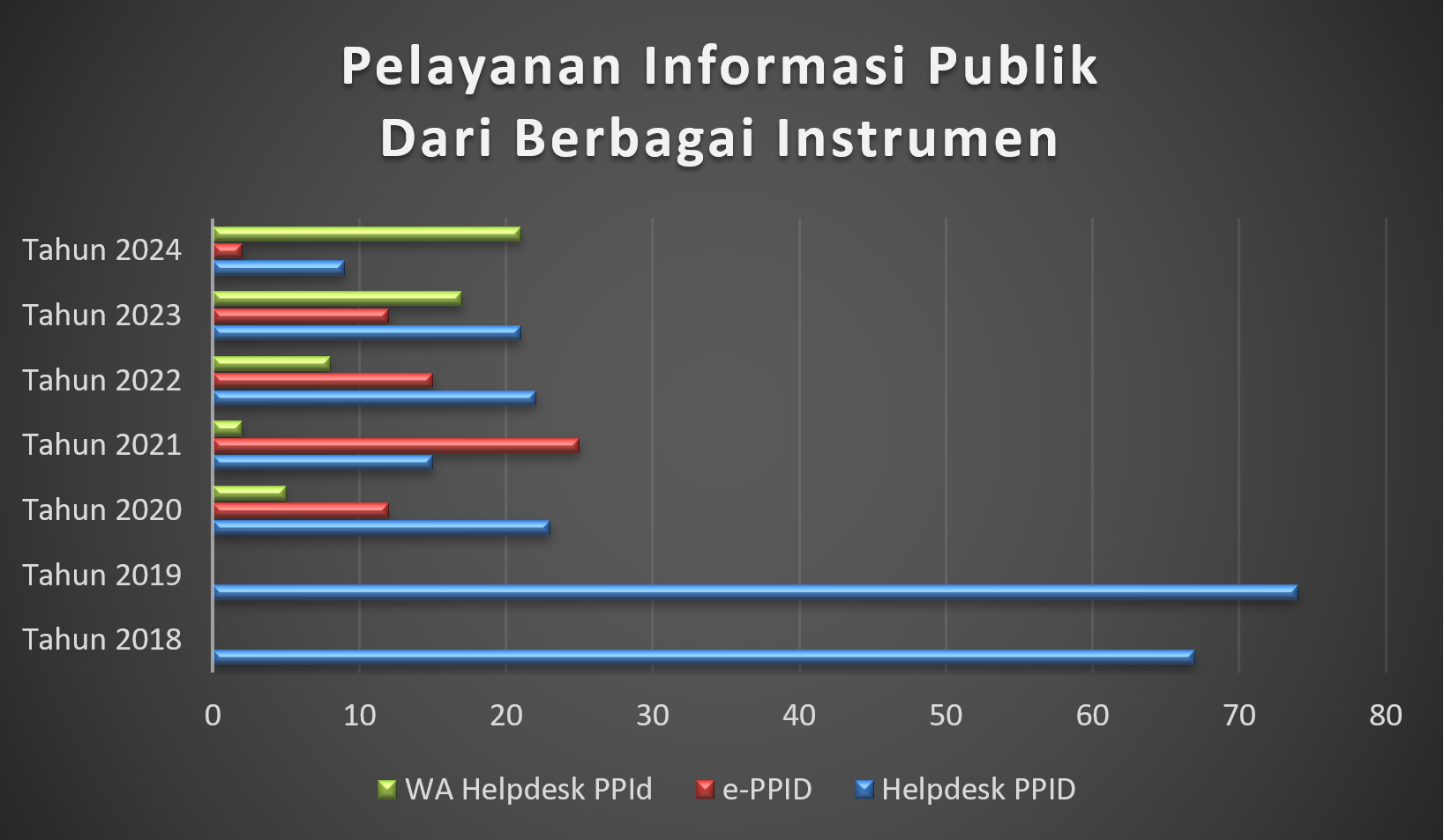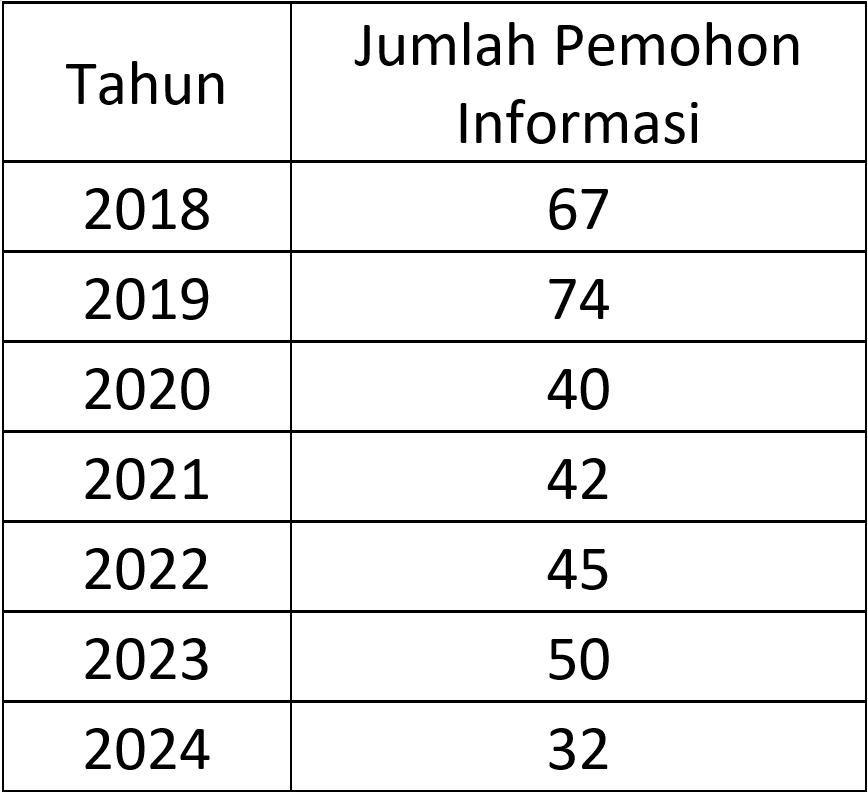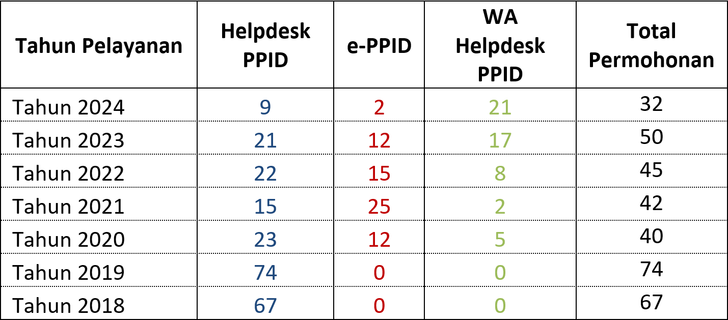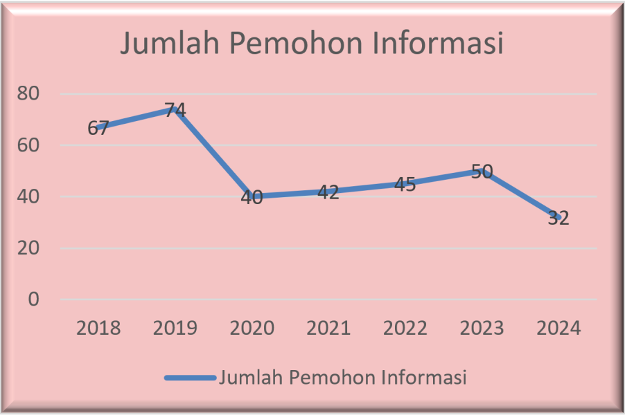 Permohonan informasi publik di KPU Provinsi Sumatera Selatan periode tahun 2018 berjumlah 67 pemohon, periode tahun 2019 berjumlah 74 pemohon, periode tahun 2020 berjumlah 40 pemohon, periode tahun 2021 sebanyak 42 pemohon permohonan Informasi Publik, periode tahun 2022 juga sebanyak 45 pemohon, periode tahun 2024 berjumlah 50 pemohon. Apabila melihat chart diatas maka dapat diambil kesimpulan bahwa peminat data dan informasi pada satker KPU Provinsi Sumatera Selatan meningkat pesat apabila berada di tahun Pemilihan Gubernur maupun Pemilihan Umum dan berasal dari berbagai kalangan, namun bila di tahun-tahun biasa maka pemohon yang datang sangat sedikit serta pemohon yang datang rata-rata berasal dari mahasiswa ataupun peneliti. Menjelang Pemilu dan Pemilihan Tahun 2024, jumlah pemohon informasi yang masuk pun meningkat perlahan-lahan bahkan menembus angka 50 pemohon. Tetapi, pada tahun 2024, permohonan informasi dan dokumentasi di Komisi Pemilihan Umum Provinsi Sumatera Selatan mengalami penurunan karena website dan media sosial resmi milik Komisi Pemilihan Umum Provinsi Sumatera Selatan telah menampilkan informasi-informasi penting terkait Pemilihan Umum Tahun 2024 serta Pemilihan Serentak Tahun 2024 sehingga masyarakat tidak perlu lagi mendatangi Helpdesk Pelayanan Informasi dan Dokumentasi baik ePPID maupun WA Helpdesk PPID untuk memperoleh informasi atau data penting terkait Pemilihan Umum Tahun 2024 serta Pemilihan Serentak Tahun 2024. Selain itu, Komisi Pemilihan Umum Republik Indonesia juga telah menyiapkan website https://infopemilu.kpu.go.id yang juga menyajikan data-data penting terkait Pemilu dan Pemilihan Serentak mulai dari tahun 2014 hingga tahun 2024. Link tersebut juga sangat mudah untuk diakses oleh masyarakat umum sehingga masyarakat umum tidak perlu lagi melakukan permohonan informasi publik dan dokumentasi ke Heldesk PPID.