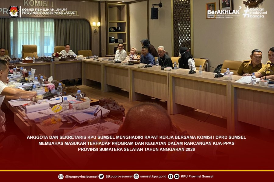 #Temanpemilih Anggota KPU Sumsel Divisi Sosdiklih Parmas dan SDM, Bapak Prahara Andri Kusuma bersama Sekretaris, Ibu Haslinda serta Kabag Keuangan, Umum dan Logistik, Bapak Muhammad Ridho, Kabag Perencanaan, Data dan Informasi, Bapak Akhmad Zakir dan Kasubbag Perencanaan Ibu Dwi Utami, menghadiri undangan rapat kerja Komisi I DPRD Sumsel dalam rangka membahas masukan terhadap program dan kegiatan dalam rancangan KUA-PPAS Provinsi Sumsel tahun anggaran 2026, Senin (15/9/2025).