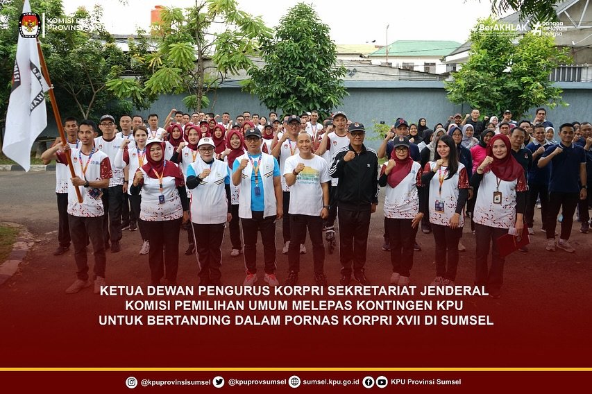 #Temanpempilih Palembang, Minggu (5/10/2025)– Ketua Dewan Pengurus KORPRI Sekretariat Jenderal Komisi Pemilihan Umum, Bapak Suryadi melepas 26 kontingen KORPRI KPU yang akan berlaga pada Pekan Olahraga Nasional (PORNAS) XVII KORPRI Tahun 2025 yang diselenggarakan di Provinsi Sumatera Selatan Mulai Tanggal 5-11 Oktober 2025 dengan mengusung semangat “Berprestasi, Sehat, dan Bersatu untuk Indonesia”.