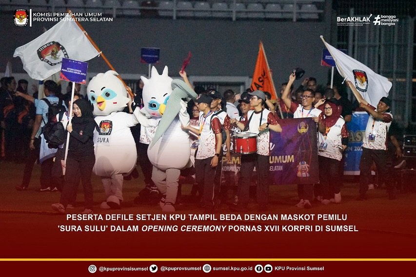 Tampil beda dengan Maskot Pemilu 'SURA SULU' peserta Defile Setjen KPU dalam Opening Ceremony PORNAS XVII KORPRI di Sumsel, partisipasi ini menunjukkan bahwa ASN KPU tidak hanya professional dalam menjalankan tugas kepemiluan, tetapi juga memiliki semangat juang dan jiwa sportivitas yang tinggi.