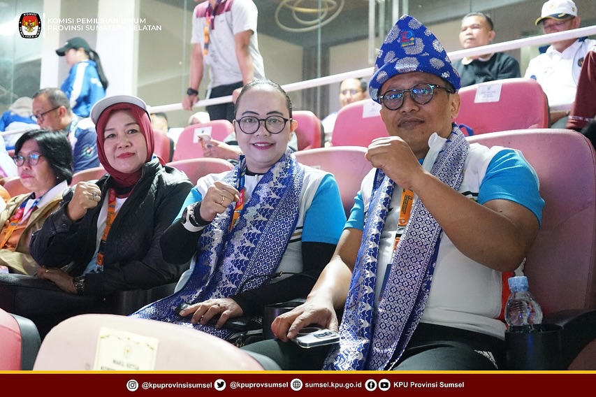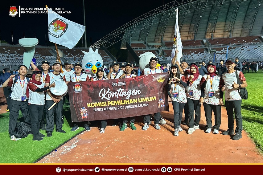 #Temanpemilih Ketua Dewan Pengurus KORPRI Sekretariat Jenderal Komisi Pemilihan Umum (KPU), Bapak Suryadi bersama Sekretaris, Ibu Yuli Hertaty, Ketua Bidang Olaharaga, bapak Ilham, Ketua Kontingen, Ibu H. Haslinda serta 26 Kontingen dan official KPU Sumsel menghadiri Opening Ceremony Pekan Olahraga Nasional (PORNAS) XVII KORPRI Tahun 2025 yang diselenggarakan di Stadion Gelora Sriwijaya Jakabaring Palembang, Minggu Malam (5/10/2025).
