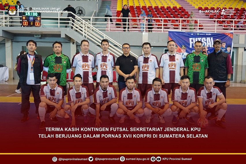 #Temanpemilih, Tim futsal Kontingen KORPRI Setjen Komisi Pemilihan Umum (KPU) tampil penuh semangat dan menjunjung tinggi sportivitas dalam pertandingan cabang futsal pada Pekan Olahraga Nasional (PORNAS) XVII KORPRI Tahun 2025 yang digelar di Provinsi Sumatera Selatan.