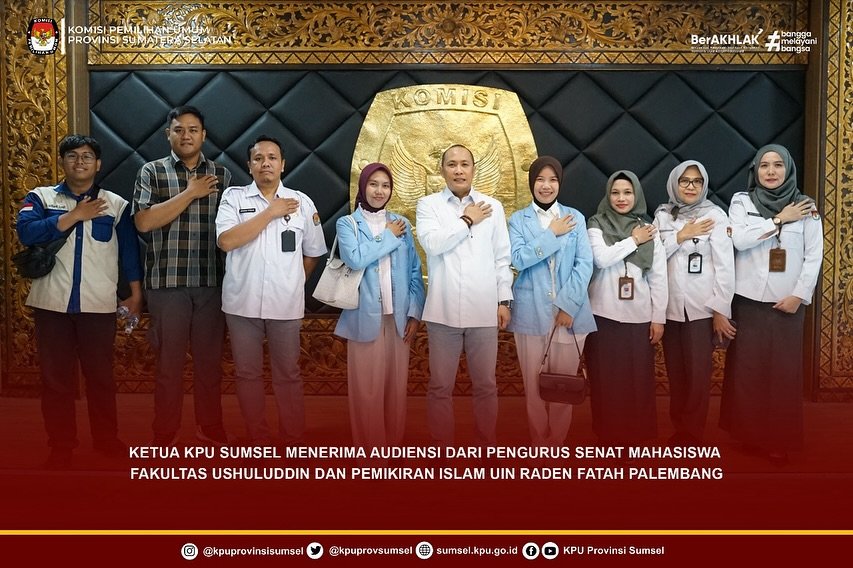 #Temanpemilih Dalam rangka persiapan kegiatan Sekolah Legislatif Fakultas Ushuluddin dan Pemikiran Islam 2025, pengurus Senat Mahasiswa Fakultas Ushuluddin dan Pemikiran Islam melakukan audiensi dengan Komisi Pemilihan Umum (KPU) Provinsi Sumatera Selatan.