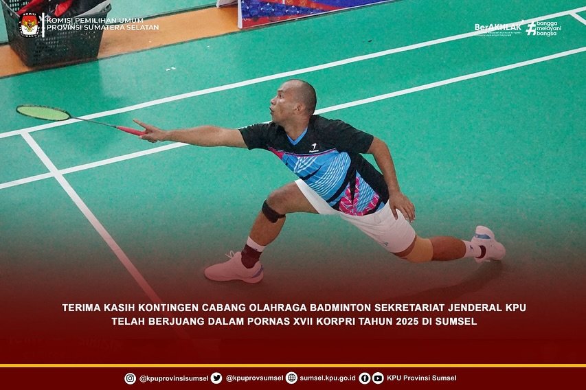 Terimakasih Kepada Kontingen Atlet Cabor Bulu Tangkis Perorangan Putra Setjen KPU, Etwin Juanda telah berjuang pada kejuaraan Pornas KORPRI ke XVII Tahun 2025 di Sumatera Selatan.