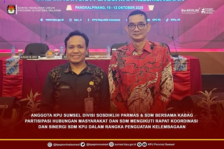 #Temanpemilih Anggota KPU Sumsel Divisi Sosialisasi Pendidikan Pemilih Partisipasi Masyarakat dan Sumber Daya Manusia, Bapak Prahara Andri Kusuma bersama Kabag Partisipasi Hubungan Masyarakat dan SDM, Bapak Akhmad Ferdian mengikuti rapat koordinasi dan sinergi SDM KPU dalam rangka penguatan kelembagaan di Pangkal Pinang, 11 s.d. 12 Oktober 2025.