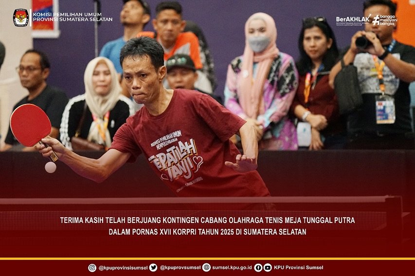 Kontingen Atlet Cabor Tenis Meja Tunggal Putra Setjen KPU, Istas Pratomo dan telah berjuang pada kejuaraan Pornas KORPRI ke XVII Tahun 2025 di Sumatera Selatan
