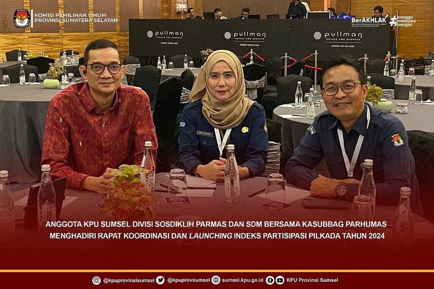 #Temanpemilih Anggota KPU Sumsel Divisi Sosialisasi Pendidikan Pemilih Partisipasi Masyarakat dan Sumber Daya Manusia, Bapak Prahara Andri Kusuma bersama Kasubbag Partisipasi Hubungan Masyarakat, Ibu Herlis Miyanah menghadiri rapat koordinasi dan launching Indeks Partisipasi Pilkada Tahun 2024 di Jakarta, 17-19 Oktober 2025.
