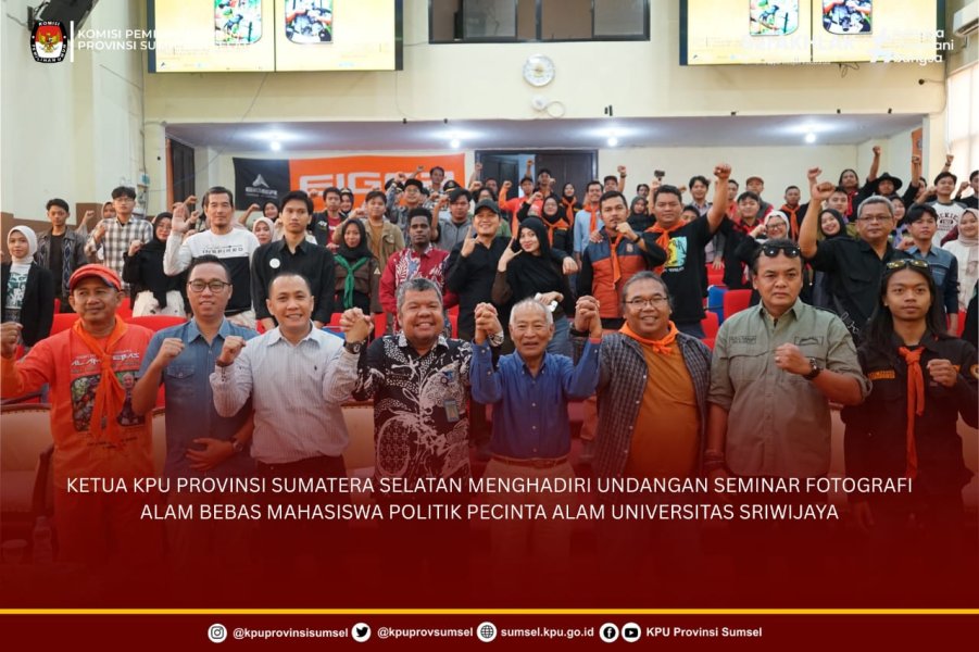 #Temanpemilih, Ketua KPU Sumsel, Andika Pranata Jaya menghadiri undangan seminar fotografi alam bebas dengan tema "Dari Hobi Menjadi Profesi" yang dilaksanakan oleh Mahasiswa Sosial Politik Pencinta Alam Universitas Sriwijaya yang merupakan bagian dari acara bertempat di Ruangan M. Isa Gedung UPT Bahasa Universitas Sriwijaya Palembang. Sabtu (01/11/2025).
