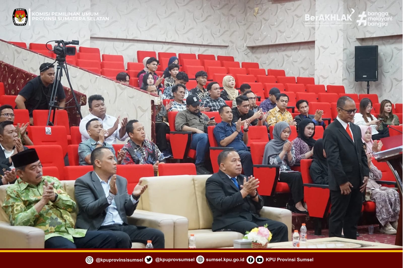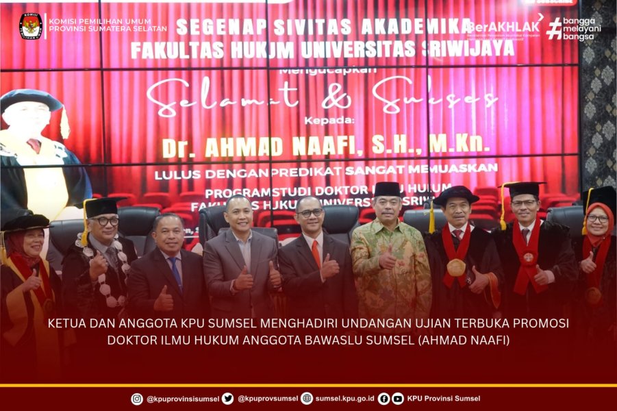 #Temanpemilih, Ketua KPU Sumsel, Andika Pranata Jaya dan Anggota Divisi Teknis Penyelenggaraan KPU Sumsel, Handoko menghadiri undangan dari Anggota Bawaslu Sumsel, Ahmad Naafi pada Ujian Terbuka Promosi Doktor Ilmu Hukum bertempat di FH Tower lt. 8 Fakultas Hukum Universitas Sriwijaya. Sabtu (01/11/2025).
