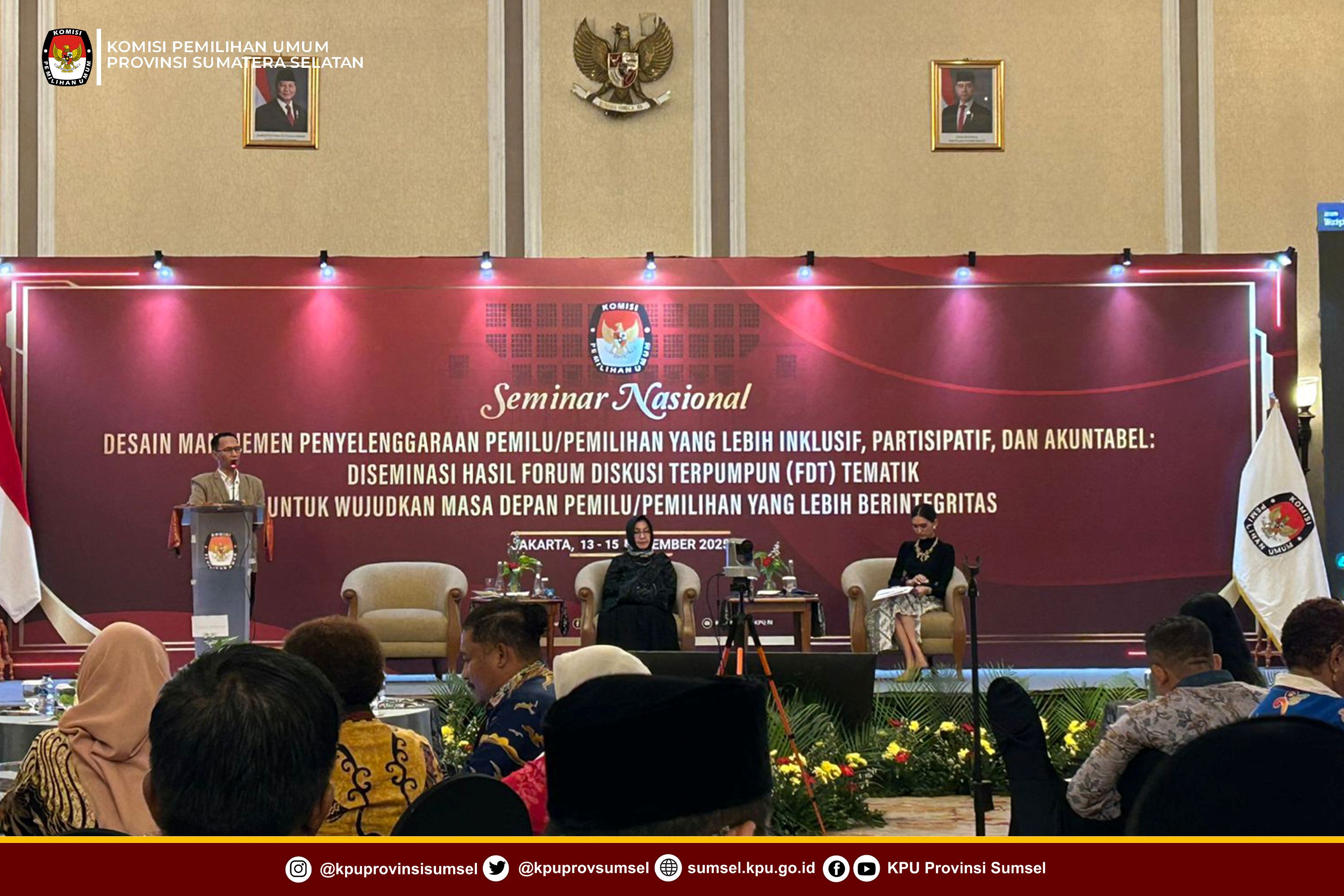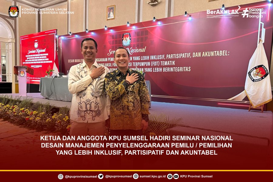 #Temanpemilih Ketua bersama Anggota KPU Provinsi Sumatera Selatan , Andika Pranata Jaya dan Handoko menghadiri yang Lebih Inklusif, Partisipatif, dan Akuntabel yang diselenggarakan oleh Komisi Pemilihan Umum (KPU) RI. Seminar ini berlangsung pada Kamis hingga Sabtu, 13–15 November 2025.