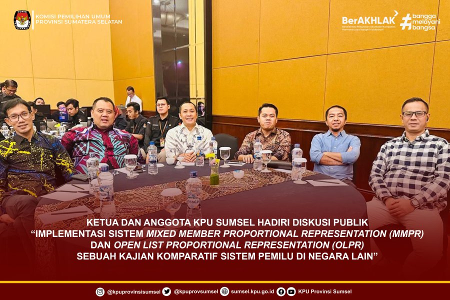 #Temanpemilih Ketua Bersama Anggota Divisi Teknis Penyelenggaraan KPU Sumsel, Andika Pranata Jaya dan Handoko menghadiri kegiatan Diskusi Publik bertajuk "Implementasi Sistem Mixed Member Proportional Representation (MMPR) dan Open List Proportional Representation (OLPR) sebuah kajian komparatif sistem Pemilu di Negara lain" yang diselenggarakan oleh Komisi Pemilihan Umum (KPU) RI. Kegiatan ini berlangsung pada tanggal 18 s.d. 21 November 2025 bertempat di Bandung, Jawa Barat.