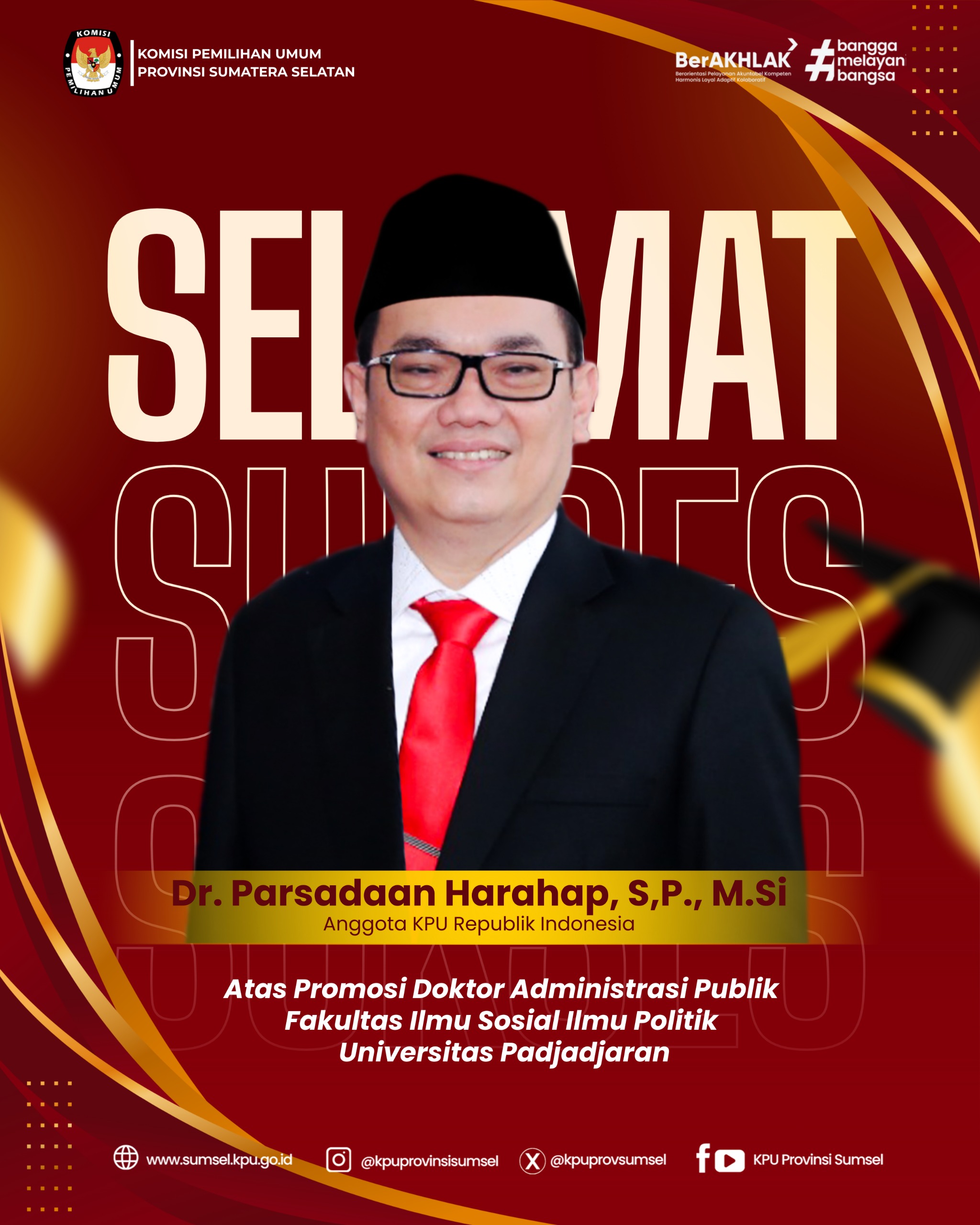 #Temanpemilih KPU Provinsi Sumatera Selatan mengucapkan selamat dan sukses kepada Bapak Dr. Parsadaan Harahap, S.P., M.Si, Anggota KPU Republik Indonesia atas promosi Doktor Administrasi Publik Fakultas Ilmu Sosial dan Ilmu Politik Universitas Padjajaran.