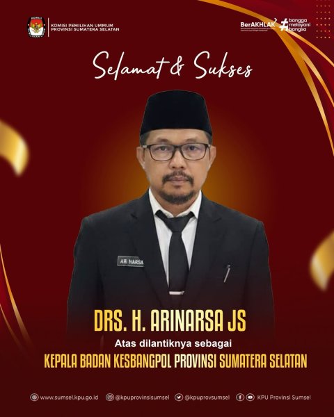 Selamat dan sukses atas dilantiknya Bapak Drs. H. Arinarsa JS sebagai Kepala Badan Kebangpol Provinsi Sumatera Selatan.