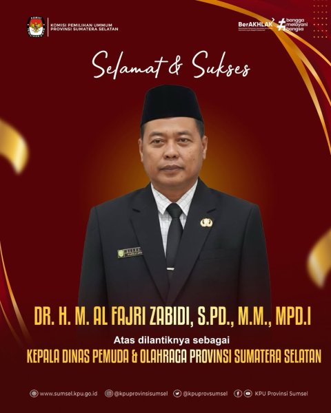 Selamat dan sukses atas dilantiknya Bapak Dr. H. M. Al Fajri Zabidi sebagai Kepala Dinas Pemuda dan Olahraga Provinsi Sumatera Selatan.