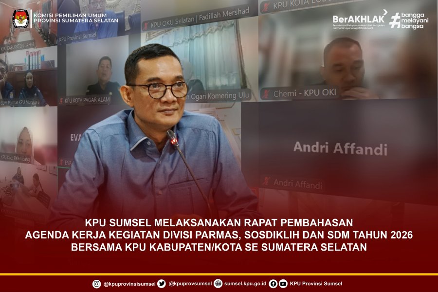 Hadir pada rapat ini Kasubbag Parmas KPU Sumsel, Kasubbag SDM KPU Sumsel dan Divisi Sosdiklih, Parmas dan SDM KPU Kabupaten/Kota se Sumatera Selatan.