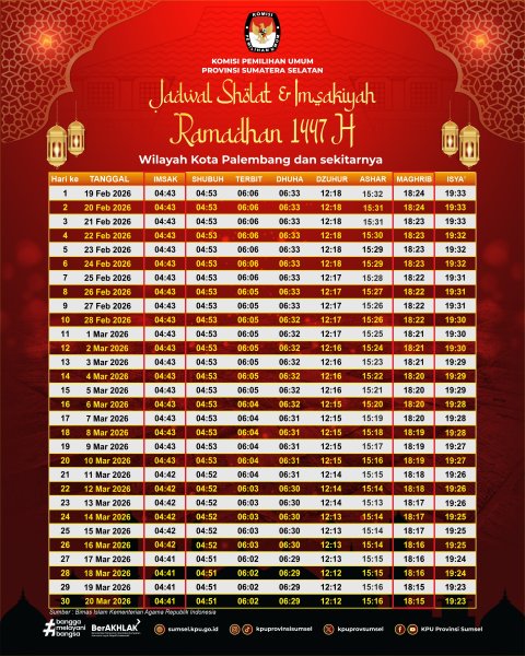 Lihat Selengkapnya pada link berikut : Jadwal Imsakiyah 1447 H Wilayah Kota Palembang dan Sekitarnya