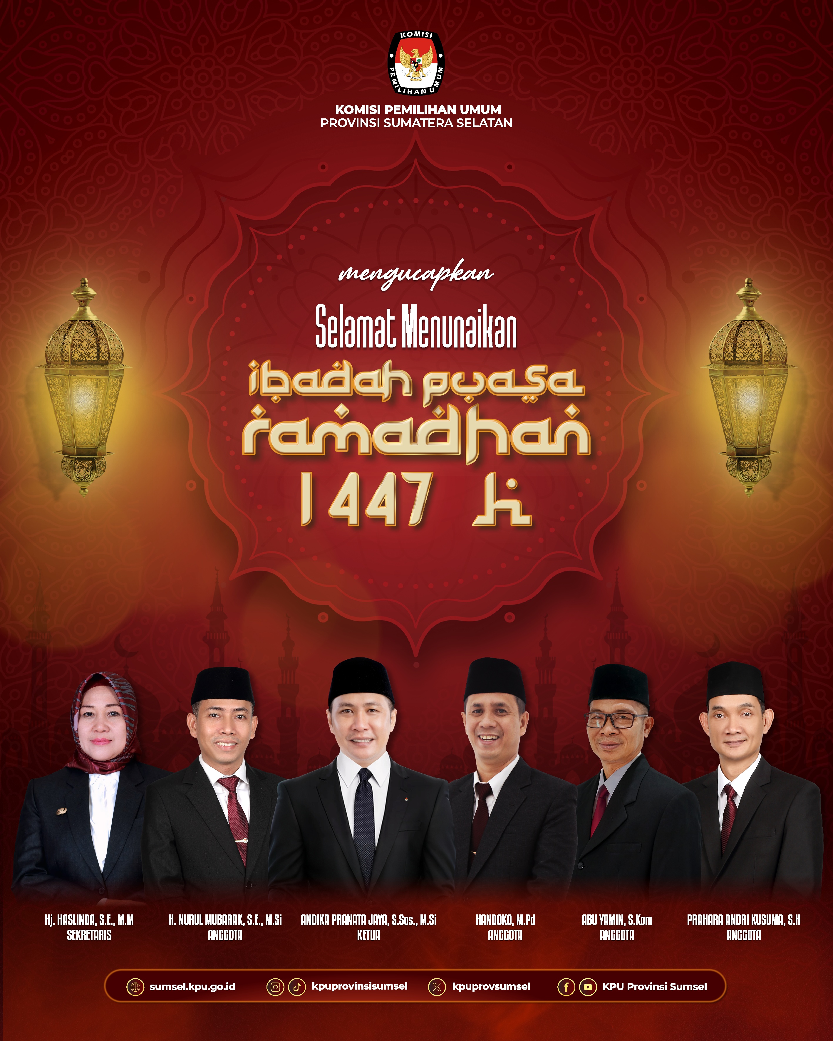 #Temanpemilih, Segenap Jajaran Komisi Pemilihan Umum Provinsi Sumatera Selatan mengucapkan Selamat menjalankan ibadah puasa Ramadhan 1447 H.