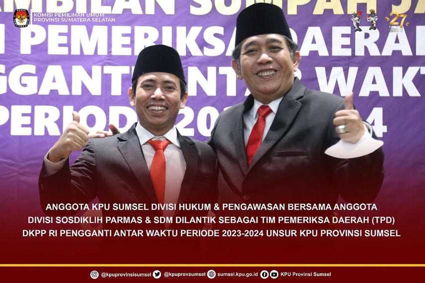 Dua Anggota KPU Sumsel tersebut dilantik langsung oleh Ketua DKPP RI bersama 16 orang TPD unsur KPU dan 3 orang TPD unsur Masyarakat berdasarkan Surat Keputusan Ketua DKPP Nomor 92.A/SK/K.DKPP/SET-03/V/2024 tentang pengangkatan Tim Pemeriksa Daerah Pengganti Antarwaktu Periode 2023-2024.