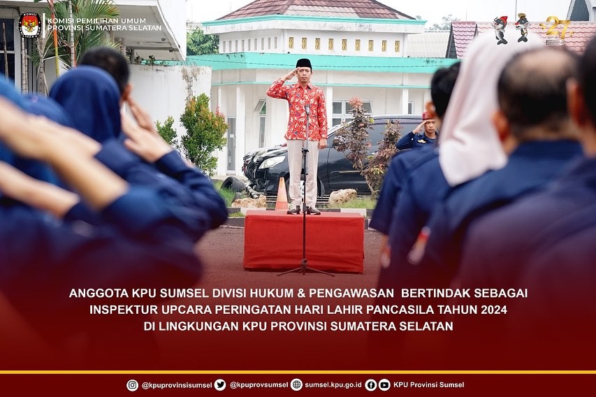 Anggota KPU Sumsel Divisi Hukum & Pengawasan Bertindak Sebagai Inspektur Upacara Peringatan Hari Lahir Pancasila Tahun 2024 di Lingkungan KPU Provinsi Sumsel