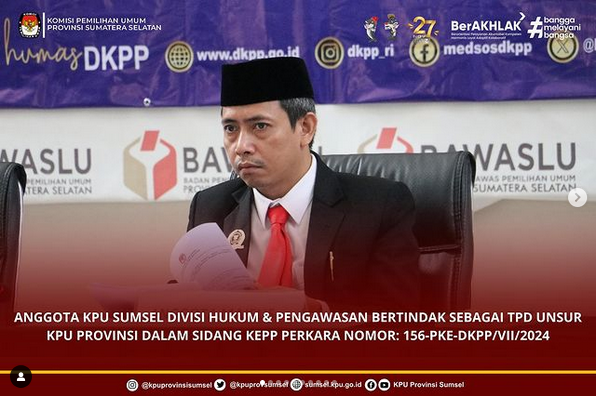 #Temanpemilih Bertempat di Ruang Sidang Bawaslu Provinsi Sumatera Selatan, Senin (23/09/2024) Anggota KPU Provinsi Sumatera Selatan Divisi Hukum dan Pengawasan, Bapak Nurul Mubarok bertindak sebagai Tim Pemeriksa Daerah unsur KPU Provinsi dalam sidang pelanggaran Kode Etik Penyelenggara Pemilu (KEPP) perkara nomor: 156-PKE-DKPP/VII/2024 dengan teradu Ketua dan Anggota KPU Kabupaten Musi Banyuasin serta Sekretaris KPU Kabupaten Musi Banyuasin.