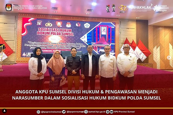 #Temanpemilih Anggota KPU Sumsel Divisi Hukum dan Pengawasan, Bapak Nurul Mubarok menjadi narasumber dalam sosialisasi hukum Bidkum Polda Sumsel bertajuk “Kesiapan Polda Sumsel dan Jajaran dalam Penyelenggaraan Pilkada Serentak Tahun 2024 yang aman, kondusif dan berkeadilan diAula Gedung Presisi Mapolda Sumsel, Rabu (25/9/2024).