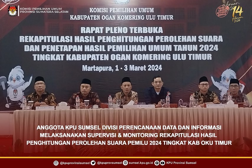 #TemanPemilih, Anggota KPU Provinsi Sumsel Divisi Perencanaan Data dan Informasi, Bapak Prahara Andri Kusuma melaksanakan supervisi dan monitoring rapat pleno terbuka rekapitulasi hasil penghitungan perolehan suara Tingkat Kabupaten/Kota di Kabupaten Ogan Komering Ulu Timur, Sabtu (2/3/2024).