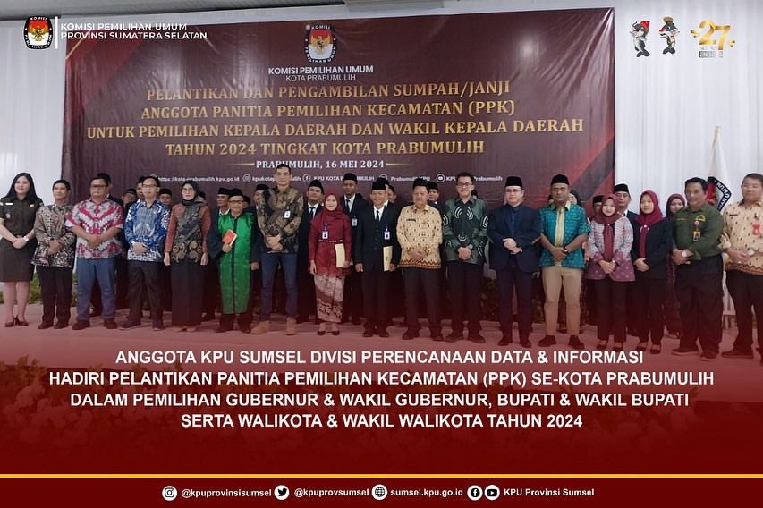 #Temanpemilih, #Temanpemilih Anggota KPU Sumsel Divisi Perencanaan Data dan Informasi, Bapak Prahara Andri Kusuma menghadiri pelantikian Anggota PPK se-Kota Prabumulih dalam Pemilihan Gubernur dan Wakil Gubernur, Bupati dan Wakil Bupati serta Walikota dan Wakil Walikota tahun 2024, Kamis (16/5/2024).