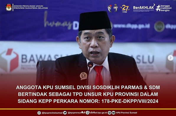 #Temanpemilih Bertempat di Ruang Sidang Bawaslu Provinsi Sumatera Selatan, Selasa (24/09/2024) Anggota KPU Provinsi Sumatera Selatan Divisi Sosdiklih Parmas dan SDM, Bapak Rudiyanto Pangaribuan bertindak sebagai Tim Pemeriksa Daerah unsur KPU Provinsi dalam sidang pelanggaran Kode Etik Penyelenggara Pemilu (KEPP) perkara nomor: 178-PKE-DKPP/VIII/2024 dengan teradu Ketua dan Anggota Bawaslu Kabupaten OKU serta staf Bawaslu Kabupaten OKU.