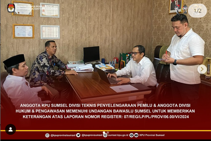 #TemanPemilih, Anggota KPU Sumsel Divisi Teknis Penyelenggaraan Pemilu, Bapak Handoko bersama Anggota Divisi Hukum dan Pengawasan memenuhi undangan Bawaslu Sumsel untuk memberikan keterangan terkait prosedur pelaksanaan Penghitungan Ulang Surat Suara (PUSS) Kabupaten Lahat dan mekanisme pembukaan kotak surat suara atas laporan nomor register: 07/REG/LP/PL/PROV/06.00/VI/2024 di Kantor Bawaslu Sumsel, Senin (15/7/2024).
