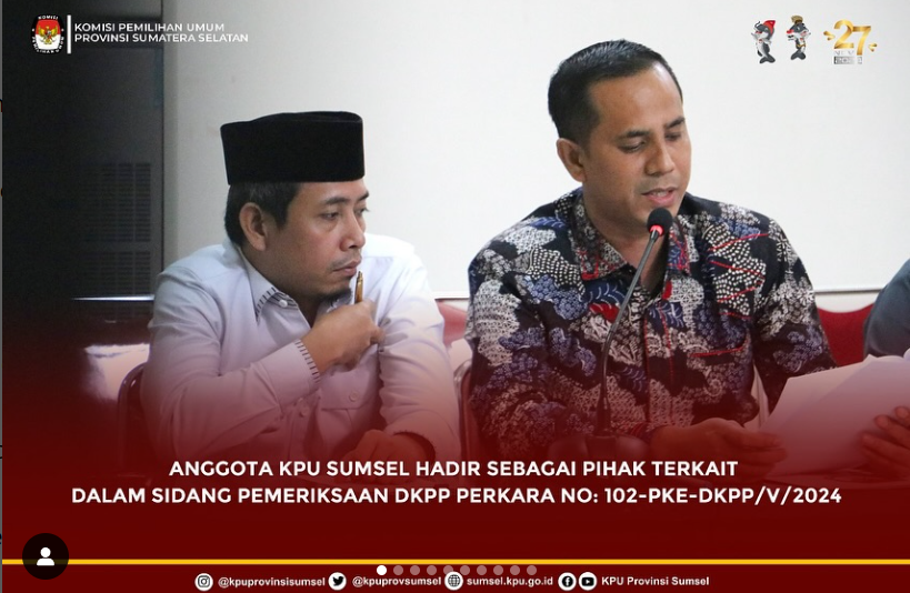 #Temanpemilih Anggota KPU Sumsel Divisi Teknis Penyelenggaraan Pemilu, Bapak Handoko dan Anggota Divisi Hukum dan Pengawasan, Bapak Nurul Mubarok hadir sebagai pihak terkait dalam siding pemeriksaan DKPP perkara Nomor: 102-PKE-DKPP/V/2024 dalam agenda mendengarkan pokok pengaduan dari pengadu, jawaban teradu dan mendengarkan keterangan pihak terkait/ saksi di ruang sidang Bawaslu Sumsel, Senin (15/7/2024).