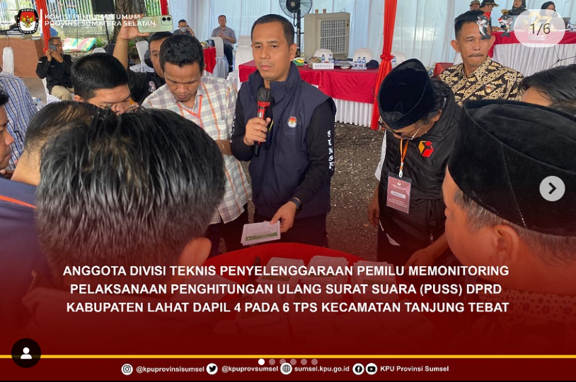 #Temanpemilih, Anggota KPU Sumsel Divisi Teknis Penyelenggaraan Pemilu, Bapak Handoko memonitoring pelaksanaan Penghitungan Ulang Surat Suara (PUSS) Anggota DPRD Kabupaten Lahat Dapil 4 pada 6 TPS di Kecamatan Tanjung Tebat. Dilaksanakan di Halaman Kantor KPU Kabupaten Lahat, Rabu (19/6/2024). Dihadiri oleh Anggota KPU Sumsel, Bawaslu Sumsel, Ketua dan Anggota KPU Lahat, Bawaslu Lahat, Saksi Partai Politik Peserta Pemilu serta Forkopimda.
