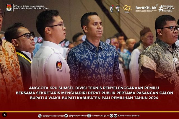 #Temanpemilih Anggota KPU Sumsel Divisi Teknis Penyelenggaraan Pemilu, Bapak Handoko bersama Sekretaris, Bapak Eko Iswantoro menghadiri debat publik pertama para pasangan calon Bupati dan Wakil Bupati Kabupaten Penukal Abab Lematang Ilir (PALI) Pemilihan tahun 2024 di Novotel Palembang, Senin (7/10/2024).