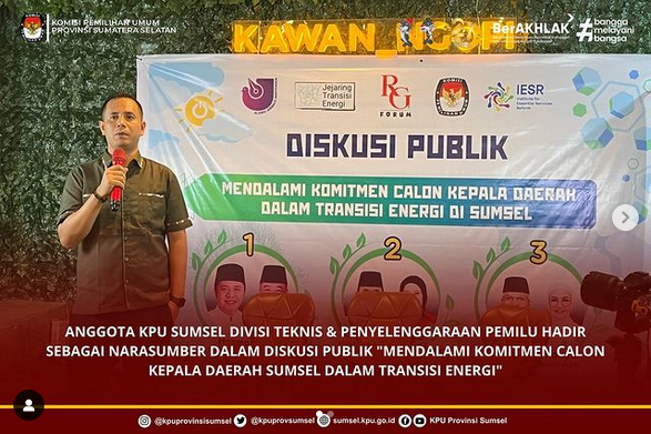 #Temanpemilih Anggota KPU Sumsel Divisi Teknis Penyelenggaraan Pemilu, Bapak Handoko menjadi narasumber dalam diskusi publik bertajuk "Mendalami Komitmen Calon Kepala Daerah dalam Transisi Energi di Sumsel" yang diselenggarakan oleh Rmoll Sumsel di Cafe Kawan Ngopi, Jum'at (22/11/2024).