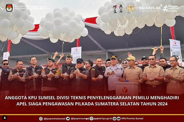 #Temanpemilih Anggota KPU Sumsel Divisi Teknis Penyelenggaraan Pemilu, Bapak Handoko menghadiri apel siaga pengawasan Pilkada Sumatera Selatan yang diselenggarakan oleh Bawaslu Sumsel di Benteng Kuto Besak Palembang, Selasa (8/10/2024).