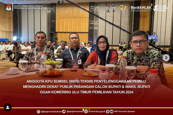 #Temanpemilih Anggota KPU Sumsel Divisi Teknis Penyelenggaraan Pemilu, Bapak Handoko menghadiri debat publik pasangan calon Bupati dan Wakil Bupati OKU Timur Pemilihan tahun 2024 di Hotel Santika Premiere, Minggu (27/10/2024).