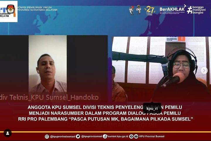 #Temanpemilih Anggota KPU Sumsel Divisi Teknis Penyelenggaraan Pemilu, Bapak Handoko menjadi narasumber dala program dialog pasca Pemilu RRI Pro Palembang bertajuk " Pasca Putusan MK, Bagaimana Pilkada Sumsel, Kamis (22/8/2024).