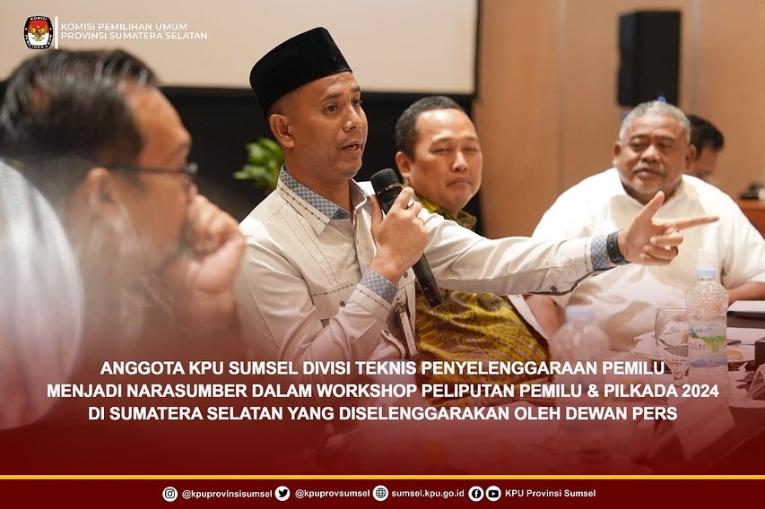 Anggota KPU Sumsel Divisi Teknis Penyelenggaraan Pemilu Menjadi Narasumber Dalam Workshop Peliputan Pemilu & Pilkada 2024 di Sumatera Selatan Yang Diselnggarakan Oleh Dewan Pers