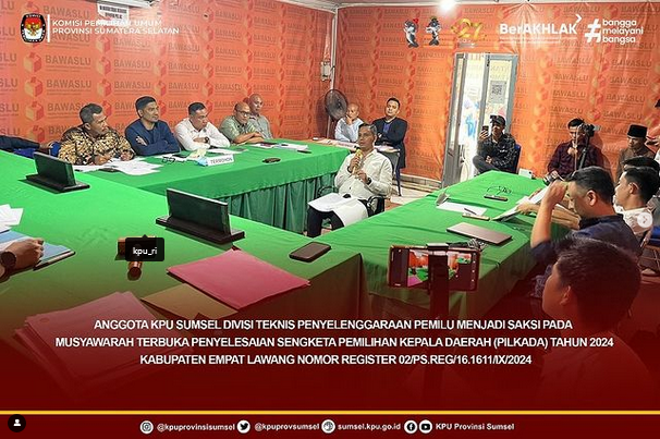 Anggota KPU Sumsel Divisi Teknis Penyelenggaraan Pemilu, menjadi saksi pada musyawarah terbuka Penyelesaian Sengketa Pemilihan Kepala Daerah (Pilkada) Tahun 2024