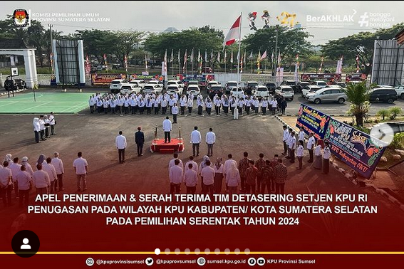 #Temanpemilih KPU Provinsi Sumatera Selatan melaksanakan Apel penerimaan dan serah terima Tim Detasering atau Tim penugasan perbantuan sementara ASN Sekretariat Jenderal KPU RI pada Satker KPU Kota Palembang, KPU Kabupaten Ogan Koering Ilir, KPU Kabupaten Muara Enim dan KPU Kabupaten Lahat Sumatera Selatan dalam Pemilihan serentak tahun 2024, Senin (2/9/2024).
