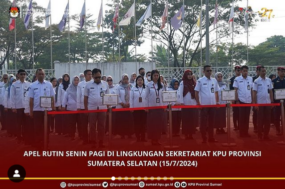 #Temanpemilih, KPU Provinsi Sumatera Selatan melaksanakan apel rutin senin pagi di lingkungan sekretariat KPU Sumsel, (15/7/2024).