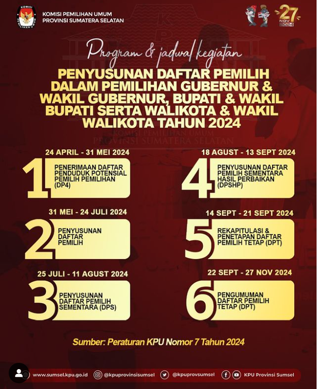 #Temanpemilih, berikut program dan jadwal kegiatan tahapan penyusunan daftar pemilih dalam penyelenggaraan Pemilihan Gubernur dan Wakil Gubernur, Bupati dan Wakil Bupati serta Walikota dan Wakil Walikota Tahun 2024 berdasarkan Peraturan KPU Nomor 7 Tahun 2024.