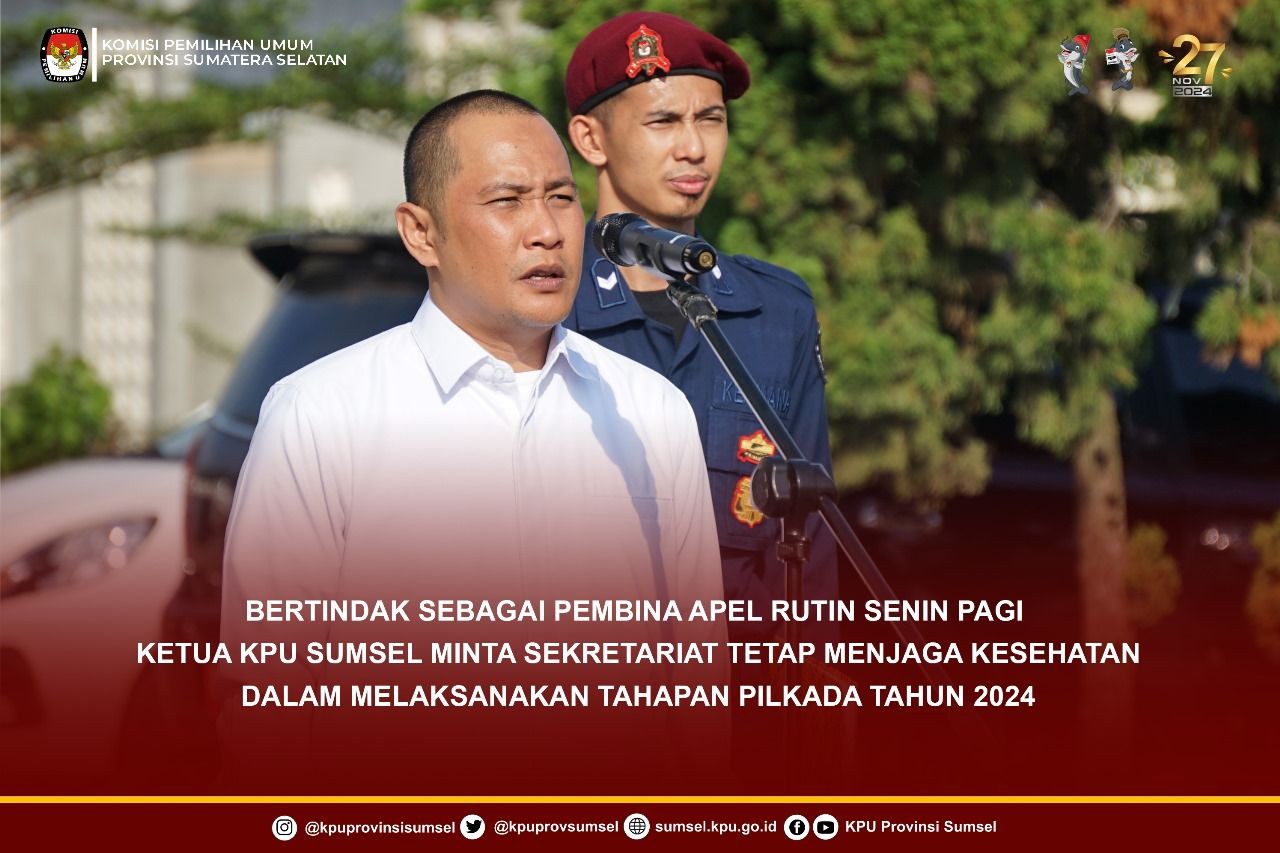 Dalam amanatnya beliau meminta kepada jajaran sekretariat untuk tetap menjaga stamina dan kesehatan dalam melaksanakan tahapan Pemilihan Gubernur dan Wakil Gubernur, Bupati dan Wakil Bupati serta Walikota dan Wakil Walikota Sumsel Tahun 2024.
