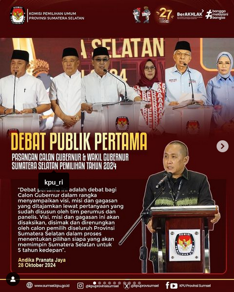 #Temanpemilih KPU Sumsel melaksanakan debat pertama antar Pasangan Calon Gubernur dan Wakil Gubernur Sumatera Selatan Pemilihan Tahun 2024 dengan Tiga Pasangan Calon dan disiarkan secara langsung melalui chanel youtube dan Instagram KPU Provinsi Sumsel serta TVRI Sumsel di Novotel Palembang, Senin (28/10/2024).