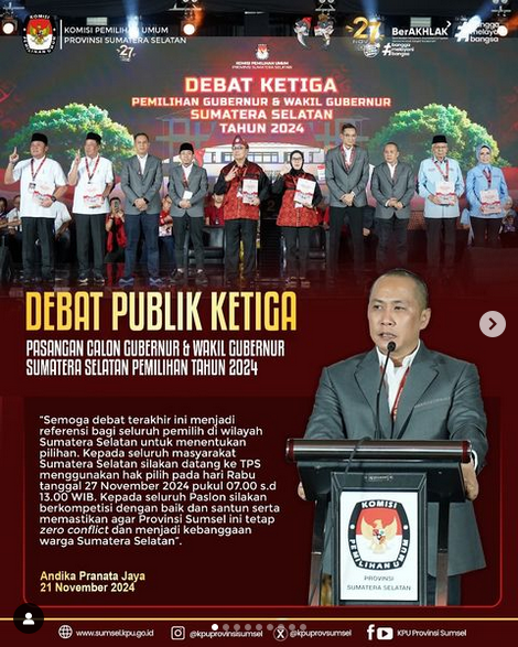 #Temanpemilih KPU Provinsi Sumatera Selatan melaksanakan debat ketiga Pasangan Calon Gubernur dan Wakil Gubernur Sumatera Selatan Tahun 2024 yang disiarkan secara langsung melalui CNN Indonesia serta chanel youtube dan Instagram KPU Sumsel di Hotel Aryaduta Palembang, Minggu (21/11/2024).