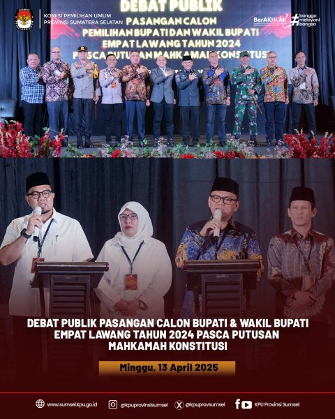 #Temanpemilih Ketua, Anggota dan Sekretaris KPU Sumsel menghadiri debat publik Pasangan Calon Bupati dan Wakil Bupati Empat Lawang tahun 2024 pasca putusan Mahkamah Konstitusi, Minggu (13/4/202).