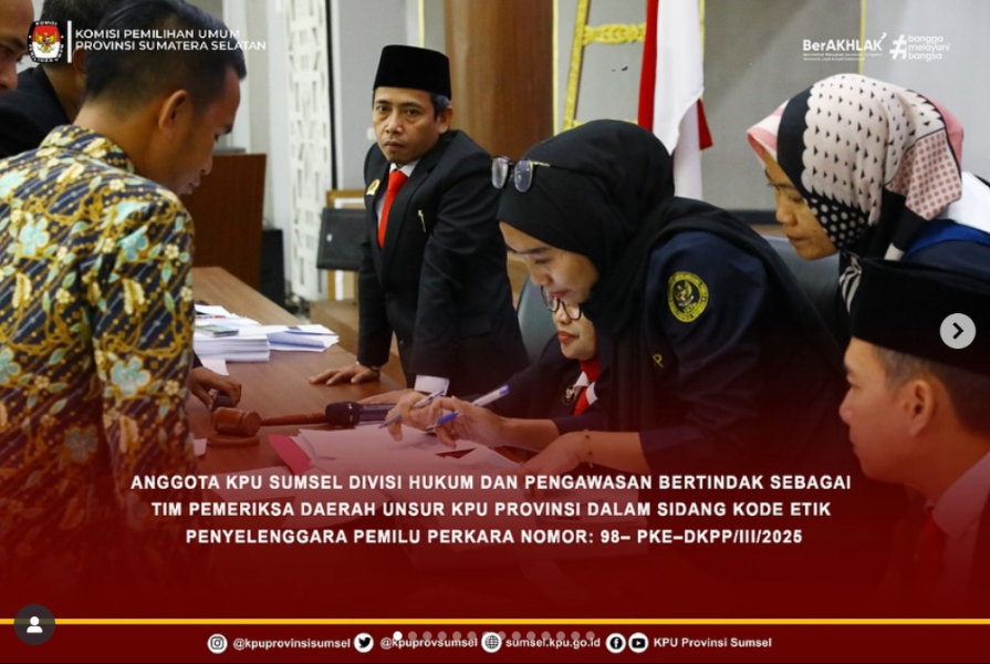 #Temanpemilih Anggota KPU Sumsel Divisi Hukum dan Pengawasan, Bapak Nurul Mubarok bertindak sebagai Tim Pemeriksa Daerah unsur KPU Provinsi dalam sidang kode etik penyelenggara pemilu perkara nomor: 98– PKE–DKPP/III/2025 di ruang sidang KPU Sumsel, Kamis (31/7/2025).
