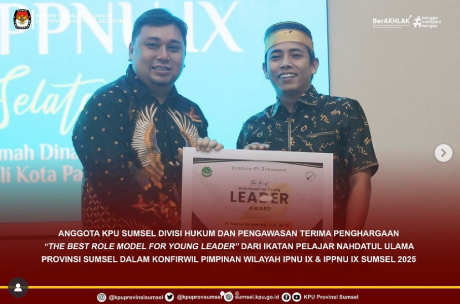 #Temanpemilih Anggota KPU Sumsel Divisi Hukum dan Pengawasan, Bapak Nurul Mubarok menerima penghargaan sebagai The Best Collaboration With Youth Organizations Award (Pemimpin Yang Mampu Berkolaborasi Terbaik dengan Organisasi Kepemudaan) dari Ikatan Pelajar Nahdatul Ulama (IPNU) Provinsi Sumatera Selatan, Sabtu (14/6/2025).